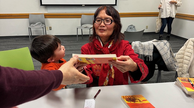 Lien (in red) engaging with the large audience of avid readers with great questions.